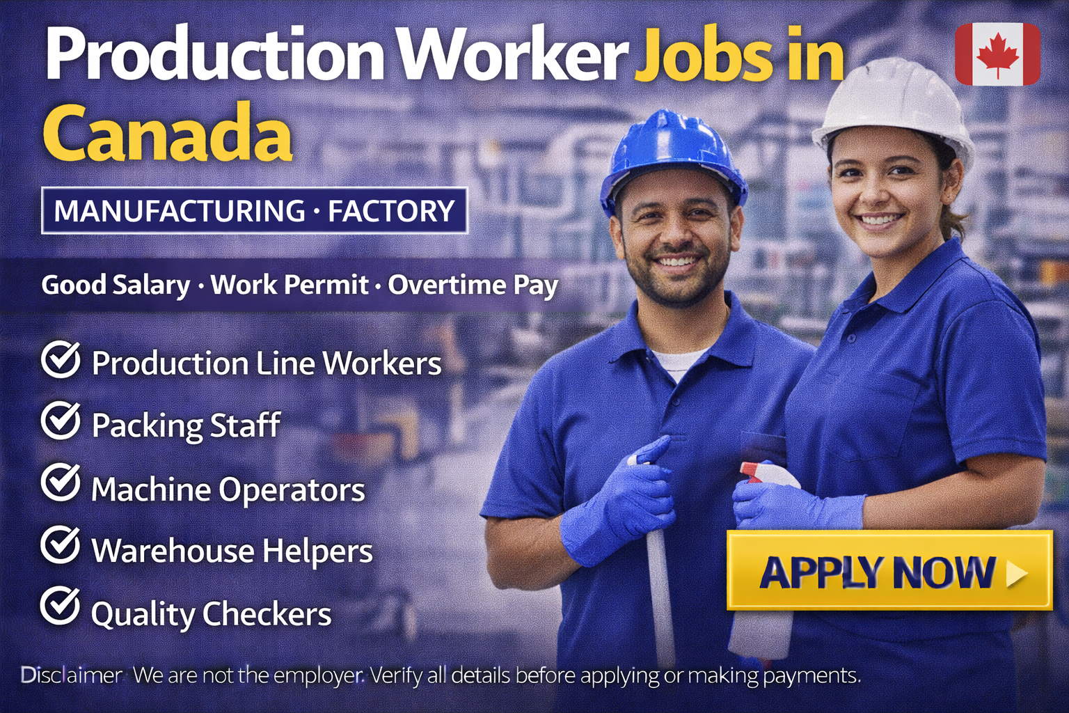 This job advertisement is for informational purposes only. We are not the direct employer or hiring company. Recruitment depends on employer requirements, interviews, and document approval. Work permits and visa approvals are subject to official Canadian immigration laws. Candidates must verify all details before making any payment. We do not guarantee job placement or visa approval.